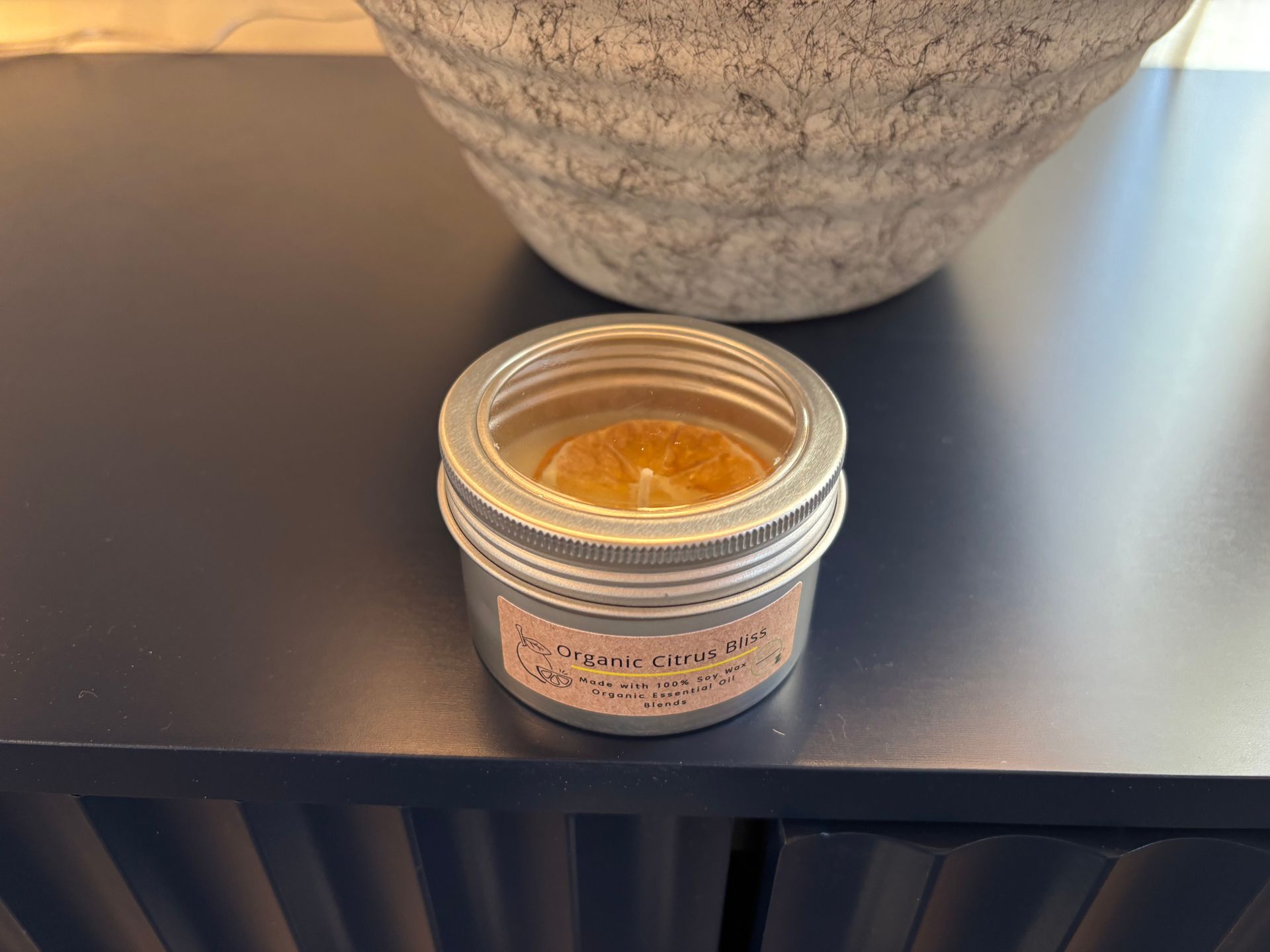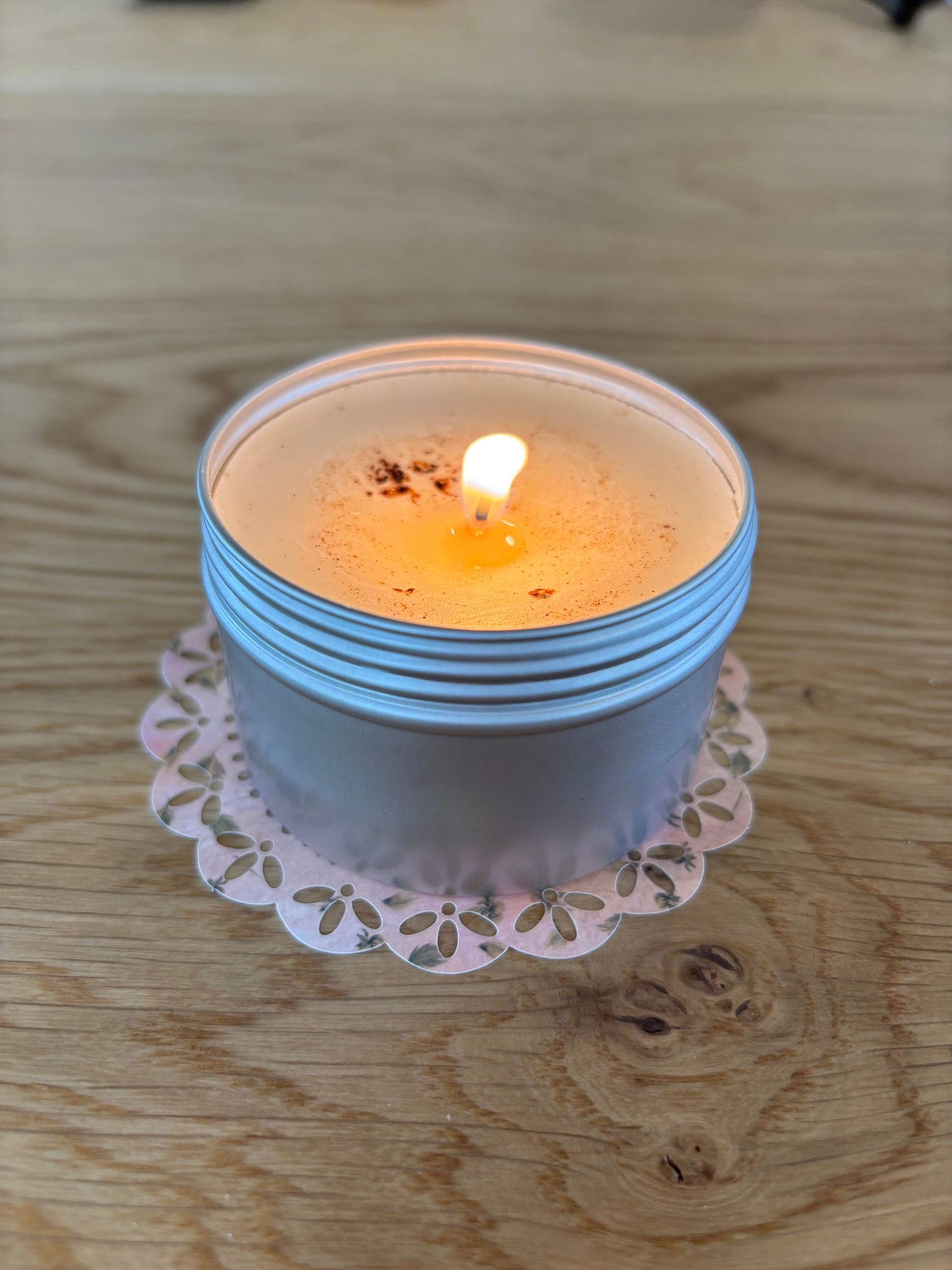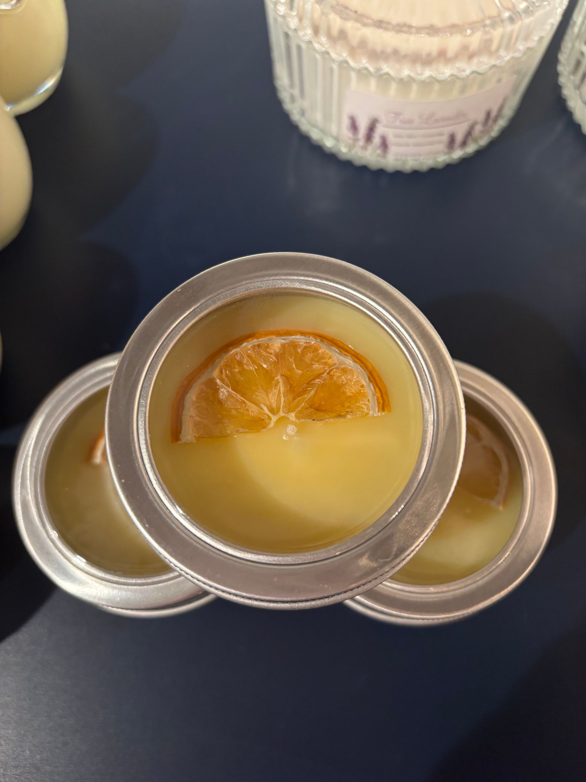7 Oz essential oils blends candle and 2.85 Oz of tin travel candle with top decorations.