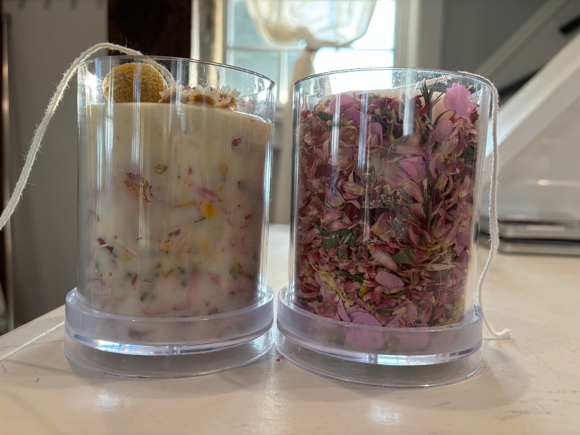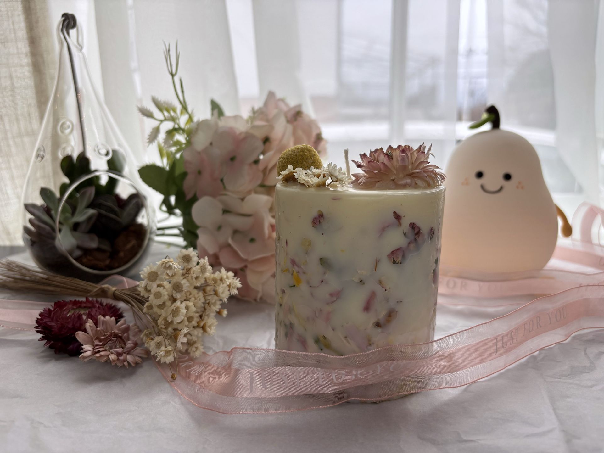A decorative candle designed to resemble a bouquet of flowers. Hand-poured aroma scented soy wax to a pillar mold and adding beautiful dry flowers and dry plants leaves.